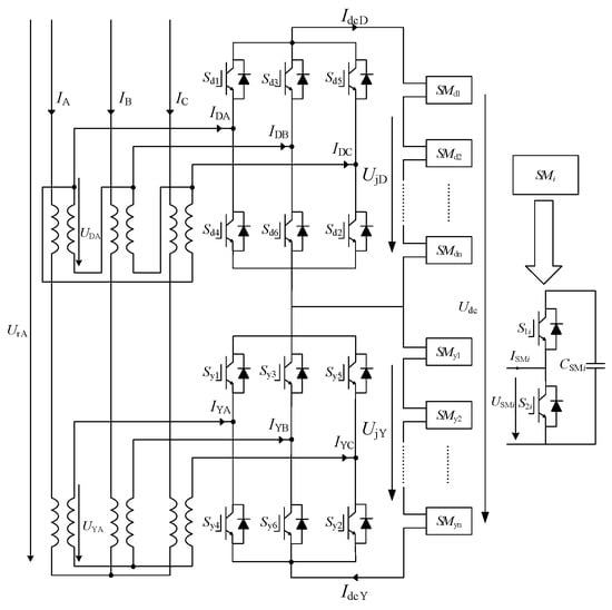 Figure 1 illustrates the m-level (m = n + 1) novel RMVSC topology. The currents IA, IB, and IC represent the ac currents of the RMVSC. The ac currents IDi and IYi (i = A, B, C) correspond to the D and Y main bridge, respectively. The phase voltages UDA and UYA correspond to the D and Y windings on the transformer’s valve side, respectively. The reinjection voltages UjD and UjY correspond to the D and Y bridges, respectively. The dc currents IdcD and IdcY correspond to the D and Y main bridges, respectively. The voltage Udc denotes the dc voltage. The voltage UrA denotes the A-phase voltage. SM refers to the half-bridge submodule. The transformation ratios of the Y/D and Y/Y transformers are Kn: and Kn:1, respectively.