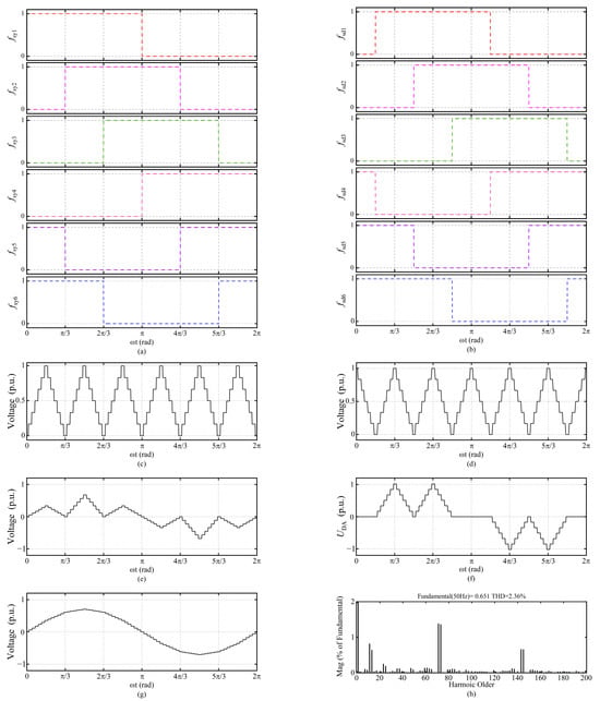 Figure 2c,d illustrate the reinjection voltages UjY and UjD for the Y bridge and D bridge, respectively. Both voltages are 7-level stepped voltages with a phase difference of 30°, which corresponds to the phase difference in the drive signals of the main bridge. At each moment, the sum of the two reinjection voltages remains a constant dc voltage.