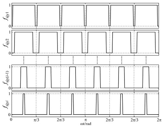 Based on Section 2.2, the instantaneous magnitude of the reinjection voltage is determined by the number of reinjection circuits conducting at any given moment. For an m-level reinjection circuit, a simple drive pulse can be designed to generate an ideal reinjection voltage waveform, meeting the required specifications. The switching function of the ith submodule (i = 1, 2, 3 … m − 1) during the kth reinjection voltage interval (k = 1, 2, 3 …) for the Y reinjection circuit can be expressed as