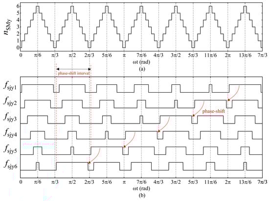 where π/3 represents the phase shift interval. An m-level RMVSC requires a phase shift period of (m − 1)π/3 to complete one cycle of cyclic triggering, during which each submodule adopts the switching functions of all other submodules in the reinjection circuit once. Using this method, a cyclic driving pulse is designed for the 7-level reinjection circuit, with a cycle period of 2π, and the cyclic driving pulse sequence is illustrated in Figure 5.