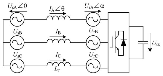 The equivalent circuit model of the RMVSC-STATCOM system is illustrated in Figure 6. The overall system can be modeled as two voltage sources connected via an interconnecting inductance Ls, with a phase difference α between them. Here, UsA, UsB, and UsC represent the grid voltages, with the grid voltage phase taken as the reference, setting the phase angle to 0. UrA, UrB, and UrC represent the ac voltages of the RMVSC-STATCOM. For simplification, the reference direction is chosen to be opposite to the grid voltage. IA, IB, and IC represent the compensation currents; θ is the power factor angle; and Udc is the dc voltage.