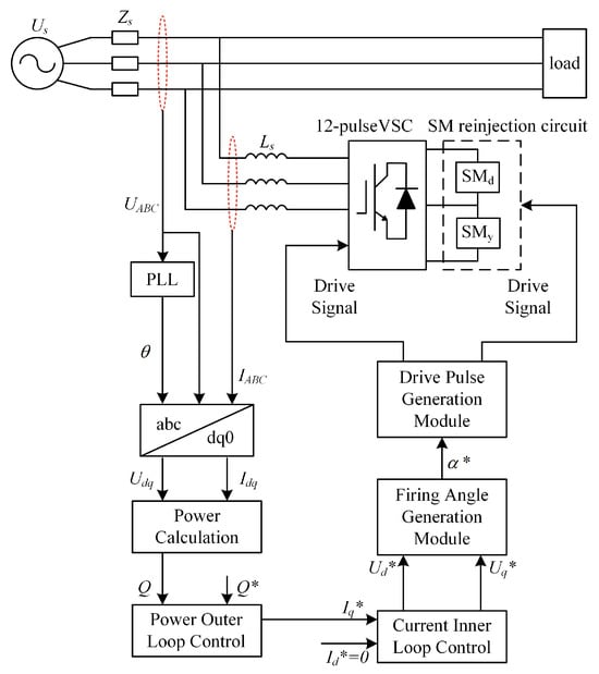 The RMVSC-STATCOM control scheme is constructed, as depicted in the control system block diagram shown in Figure 7. The RMVSC-STATCOM controller utilizes a dual-loop control system comprising an outer power loop and an inner current loop. The control strategy is implemented in the dq rotating coordinate system. Initially, the phase-locked loop (PLL) is employed to synchronize with the grid phase. Subsequently, the voltage at the grid connection point and the compensation current are transformed into the dq coordinates. Real-time reactive power is calculated based on instantaneous power theory and is utilized as the feedback parameter Q for the outer power loop. The RMVSC-STATCOM tracks Q* and Iq* through the outer power loop and inner current loop.