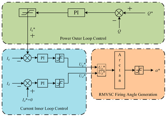 As depicted in Figure 8, the control block diagram of the RMVSC-STATCOM illustrates that the outer power loop achieves a grid-side power factor of 1 by tracking Q*. The outer power loop generates the reactive current command Iq*, while active power control is omitted, with Id* set to 0. The current control loop then tracks Iq* and Id*, outputting the active and reactive voltage command values Ud* and Uq* at the converter port. The phase conversion module generates the RMVSC-STATCOM port voltage phase angle command, which serves as the firing angle command for the RMVSC-STATCOM. This ensures continuous and accurate compensation of the system’s reactive power.