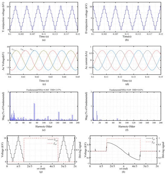 The theoretical voltage waveforms of 7-level RMVSC. (a) The switching signal of the Y main bridge. (b) The switching signal of the D main bridge. (c) Y reinjection voltage. (d) D reinjection voltage. (e) The A-phase voltage on the valve side of the Y-winding transformer. (f) The A-phase voltage on the valve side of the D-winding transformer. (g) The A-phase voltage on the grid side of the RMVSC. (h) The spectrum of the A-phase voltage.