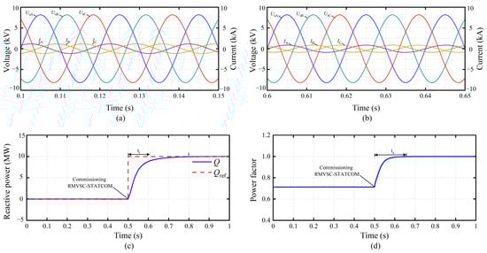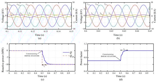 To verify performance under capacitive conditions, an inductive load of PL + jQL = 10 MW + j10 Mvar is set, with a simulation duration of 1 s. At 0.5 s, the RMVSC-STATCOM is connected to track the reactive power command for compensation. The voltage and current of the three phases before compensation are shown in Figure 10a. There is a phase difference between voltage and current; the current leads the voltage, and the power factor is 0.707. At 0.5 s, the RMVSC-STATCOM is engaged, and after tracking the compensation command, it eventually outputs 0.997 Mvar of reactive power. Following reactive power compensation, the reactive power on the power supply side is nearly 0, and the power factor improves to nearly 1, with the voltage and current phases on the power supply side aligned. The voltage and current waveforms of the three phases after compensation are shown in Figure 10b.