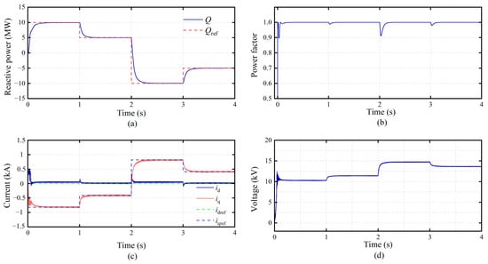 Simulation results of RMVSC-STATCOM full-range reactive power compensation capability; (a) reactive power compensation tracking; (b) power factor waveform; (c) dq-axis current tracking; (d) dc voltage waveform.