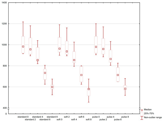 For each mode, a significant decrease in light irradiance was observed comparing zero distance with distances above 4 mm, 2 mm distance with distances above 6 mm, and 4 mm with distances above 8 mm—Figure 2. The greatest power loss with increasing distance was observed in the soft mode, the irradiance of which was statistically significantly lower at each distance than in the other modes, and at a distance of 8 mm, it did not even reach 600 mW/cm2. The standard mode achieved the highest values during the entire experiment; statistically significant differences were found at all tested distances compared to the other modes—Table 1. The irradiance values obtained when testing the pulse mode were like those in the standard mode.
