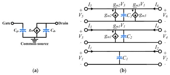 Figure 3a, has been incorporated into the study of the suggested quasi-circulator. Gate-to-source capacitance (Cgs) and drain-to-source capacitance (Cds) are the corresponding forms of capacitance. In order to provide coupling between the gate and the drain, the transconductance