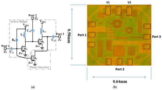 2, including the testing pads. For the fabrication of the proposed quasi-circulator, three nMOSFETs with fT values above 142 GHz were employed. In order to achieve wideband performance and smooth gain flatness, an active balun with a cascading structure was chosen. Phase cancellation is a technique that can be used to isolate the suggested quasi-circulator. The reverse phase path is enabled by the CS FET. By employing criteria, an iterative electromagnetic simulation, and a TSMC kit, it is feasible to adjust the dimensions of the practical FET and the circuit characteristics to achieve exceptional performance. In order to assess the parasitic impact, an ADS RF momentum was employed to model the passive components, such as resistors, capacitors, and inductors.