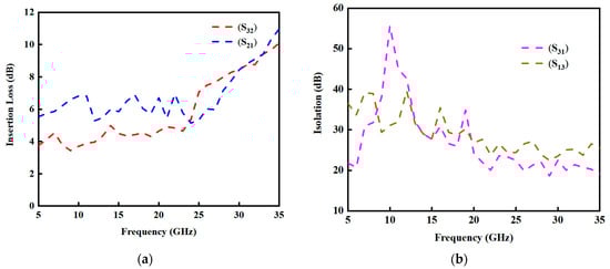 Figure 8a, which displays the measured values. S21 is around 4.8 to 10 dB, and S32 is approximately 3.4 to 9.1 dB. Based on the results of the simulation, the amplitude imbalance is found to be within the range of 1.5 dB. On the other hand, the result that was measured displays a greater deviation, which can be attributed to the excessively high