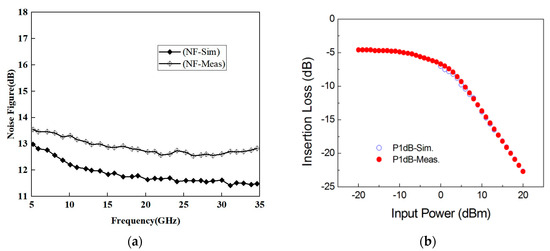 Figure 9, the measured NF in the 5–35 GHz band falls somewhere between 13 and 14 decibels, which is approximately 1 decibel higher than the simulation. At a frequency of 15 GHz, the simulated result of the input power 1 dB compression point (IP1dB) is 2.8 dBm, while the measured result is 3 dBm from port 1 to port 2. There is a significant degree of concordance between the outcomes of the simulation and those of the experiment.