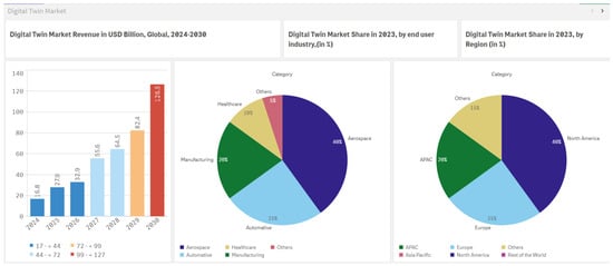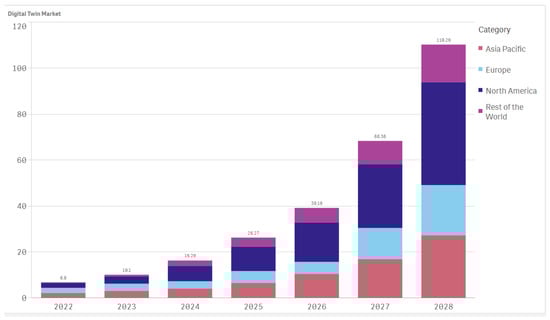 According to Gartner, over 50% of large industrial companies are expected to use Digital Twin technology by 2025, potentially achieving efficiency gains of up to 10% [22]. The market for Digital Twin technology is projected to reach USD 39 billion by 2026 and USD 110 billion by 2028 as can be seen in Figure 2, driven by increasing adoption across various sectors, including healthcare, smart cities, and energy distribution.