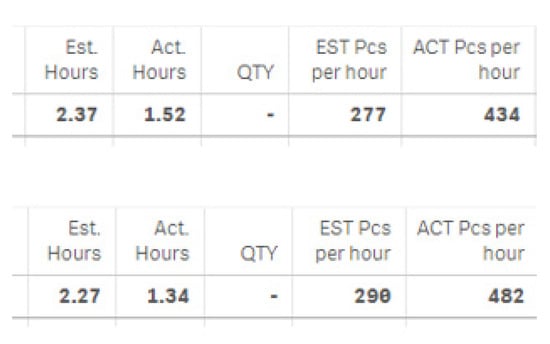 The average of production time had a decrease of 10% for the analyzed week compared with the previous week. The results are presented in Figure 25, where we are looking at the Act.Hours (Actual Production Time Duration):