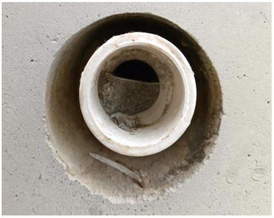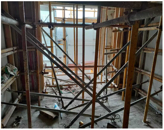 In recent years, China has vigorously promoted the high-speed development of assembly-type buildings, developing two different construction methods, namely prefabricated assembly type and integral type. As a large number of prefabricated elements are produced in an integrated manner in component plants, only a small number of structures need to be concreted on site to make the whole building structure. There are a large number of joints [1], and compared with the cast-in-place concrete structure, assembly building integrity and seismic performance are poor. For example, voids appeared at the joints of wall panels and other parts of the Yidollar Subdivision, Miaoqiao Road, Kangqiao Town, Pudong New Area, Shanghai, which was completed in May 2020. The voids caused water seepage through large areas of the external walls, resulting in the total destruction of the interior finishes, which are very expensive to repair. And, once the gap appears, the steel reinforcements at the joints of the shear wall are bound to rust slowly, which seriously affects the structural safety of the building. Therefore, the seismic performance of the connection nodes between prefabricated elements and cast-in-place structural elements is the focus of the study of structural safety [2]. At this stage, methods already include reinforcing bar sleeve grouting, reinforcing bar slurry anchor lapping, bolting or welding, and reinforcing bar mechanical connections. The actual building structure design is mainly based on the reinforcing sleeve grouted connection shear wall panel connection method [3]. The complexity of the construction process and the possible laxity of the construction operation lead to poor quality of the reinforcing sleeve connection. There is a safety hazard of defective structural connections [4], as shown in Figure 1. The shear wall structure of the residence itself has the limitation of narrow space, and vertical prefabricated components are installed with no fewer than two temporary supports [5], as shown in Figure 2. The setup of the temporary support limits the space for the construction crew to operate, which increases the difficulty of construction and affects the construction progress.