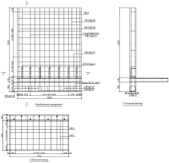 The structure of the resettlement house of a land lot expropriation in Shanghai was designed according to the “Technical Regulations for Assembled Concrete Structures” JGJ1-2014 and other [16,17,18] relevant norms and standards currently in force in the state and Shanghai. The precast elements of this project are of formwork-free supported design, among them, 4#, 7#, and 9# buildings. 4–17 floors are designed with different sizes of shear walls, such as 2000 mm long × 200 mm thick, 1400 mm long × 200 mm thick, and 1000 mm long × 200 mm thick. The prefabricated walls are provided with keyways measuring 100 mm × 100 mm on all sides, with an internal contraction of 15 mm on each side and a depth of 20 mm. Among these, the length of 2000 mm × thickness of 200 mm prefabricated shear wall corresponding to the number of sleeve configurations is 7 sets of model GT16 with an outer diameter of 48 mm and height of 310 mm. The strength class of the grout material used for the prefabricated shear wall grout sleeve connection method is C85.