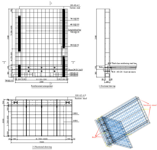 In order to solve the problems of poor integrity of assembled buildings, lower seismic performance, and water seepage at the actual structural joints, the design of the new structure proposed in this paper, which consists of a steel section + bolted shear wall, was inspired by Dr. Tan Wang’s [1] prototype design of node construction for built-in section assembled concrete shear wall. A shear wall structure using I-beams as the core of the edge restraint of the assembled shear wall was designed, with bolts acting together. This shear wall structure makes full use of the good material properties and easy construction of the I-beam, which has high strength, good stress performance, light weight, and high-strength bolts. Vertical and longitudinal horizontal reinforcement bars [19] were uniformly placed inside the precast shear wall to improve the tensile properties of the wall. The upper and lower wall limbs were connected at the floor slab by an L-shaped socket joint, which was fixed with bolts. The L-type socket connection structure can effectively prevent outdoor rainwater seepage into the room and solve the problem of water seepage on the floor. The longitudinal arrangement of steel profiles in the edge restraint zone of the shear wall and the use of bolted connections between the wall and the floor slab can effectively form the upper and lower wall limbs and the floor slab into a single unit.