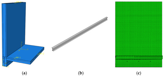 Drawing of finite element model. (a) Schematic diagram of finite element structure model. (b) Drawings of section steel components. (c) Model meshing.