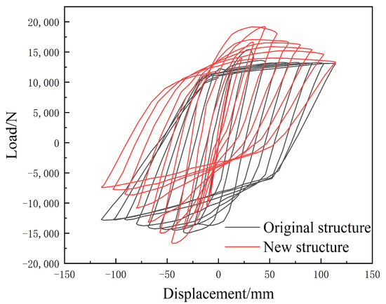 By calculating the ratio of ultimate displacement to yield displacement, it can be concluded that the negative ductility of the original structure is 2.62 times that of the new structure, while the positive ductility is 2.24 times that of the new structure. The new structure’s displacement ductility coefficients are all greater than 2, and the design codes of most countries mandate a structural ductility greater than 1.0 to meet the structural safety performance requirements. The structural ductility of Chinese buildings generally takes a value of 3–5, and the new structural ductility coefficients do not differ much from the code values. Limiting the lateral deformation of concrete by providing hoops at the restrained ends of the new structural steel sections can improve the ultimate deformation capacity of the member and give the concrete good ductility under ultimate load [22].
