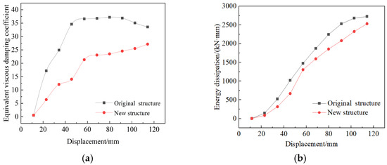 Comparisons of the equivalent viscous damping coefficient curves after yielding and the one-week hysteresis return energy dissipation curves of the two structures are shown in Figure 11. The equivalent viscous damping coefficient of the original structure increases to a greater extent than that of the new structure when the displacements are between 11.4 mm and 34.3 mm. The displacements are in the range of 34.2 mm to 57.1 mm, and the magnitudes of change in the equivalent viscous damping coefficients of the two structures are basically the same. The magnitude of the change in the equivalent viscous damping coefficient of the new structure begins to increase after the displacement is greater than 57.1 mm, and the difference in the values of the equivalent viscous damping coefficients of the two structures gradually decreases. The single-week hysteresis return energy dissipation of both the new and original structures increases with increasing structural displacement, and the energy dissipation capacity of the original structure is greater than that of the new structure for a single loading. The maximum energy dissipation of the original structure is 2.7 × 10−6 N-mm, and the maximum energy dissipation of the original structure is 2.5 × 10−6 N-mm. The original structure has a slightly higher energy consumption capacity than the new structure.
