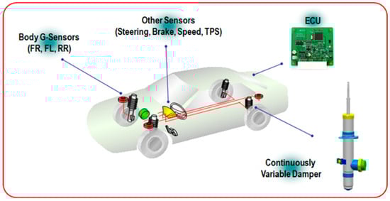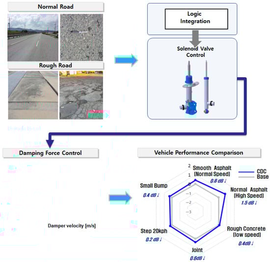 The CDC system optimizes the vehicle’s riding comfort and steering stability by changing the damping force in real time using the acceleration sensor and the vehicle’s internal signals. It receives input from the vehicle’s vertical acceleration sensor, calculates the target damping force to control the vehicle’s behavior, and changes the damping force by changing the solenoid current inside the variable damper. Figure 1 shows the system configuration.