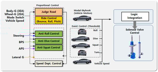 The control logic that generates the necessary target damping force by analyzing the vehicle’s behavior based on the acceleration sensor and internal vehicle signals is schematized in Figure 2. Based on the vehicle acceleration sensor, skyhook control theory is applied to perform real-time damping force proportional control, which controls vehicle ride comfort [13,14,15,16]. Moaaz and Ghazaly explored similar control approaches in semi-active suspension systems using skyhook and groundhook controllers, providing additional insights into control strategies [17]. Additionally, during an event such as a lane change, braking, or acceleration event, control is performed to control vehicle behavior. By integrating the damping force command value based on each vehicle behavior state, proportional solenoid control for changing the damper’s damping force is performed in real time, and the appropriate change in damping force affects vehicle performance [18,19].