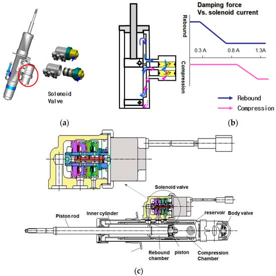 CDC damper’s internal hydraulic components and flow: (a) CDC damper’s assembly and flow; (b) fluid flow and control current; and (c) damper assembly (variable valve integration).