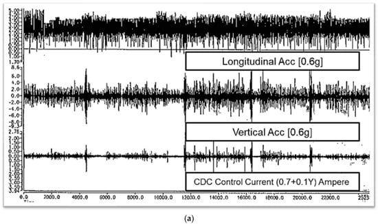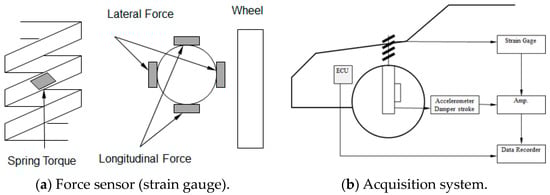 The measurement system for RLDA consists of an accelerometer, strain gauge, amp., tape recorder, and an FET drive signal recording device that records the current signal to control the solenoid valve of the damper in the vehicle’s ECU. The accelerometer and strain gauge are connected to the amp for signal amplification, and the signal is transmitted to the tape recorder through the amp. The detailed installation configuration is described in Figure 6. The control signal from the ECU’s FET driving frequency detection unit is also input to the tape recorder, and all of this equipment is mounted on the vehicle. It was continuously recorded during the driving test, and the data sampling speed of the tape recorder was 2.5 kHz, which was sufficient for use in the simulation. The detailed specifications of the acquisition facilities are described in Table 1.