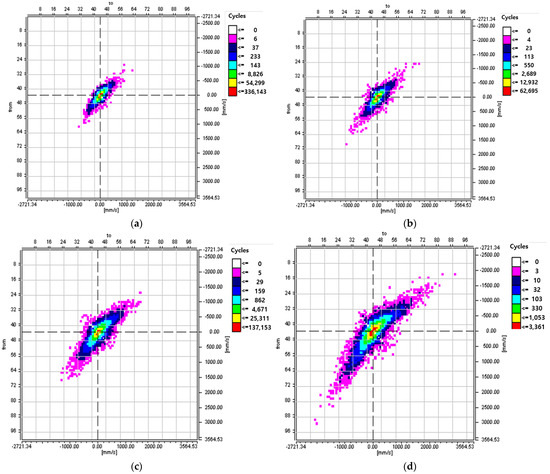 The rain flow matrix of the front damper for each driving road surface is displayed in Figure 8. The rain flow matrix represents the stress range and the number of occurrences of the cycle for each stress range. It can be seen that the speed band of the damper is widely distributed on the unpaved road and that it is distributed in the following order: (1) the unpaved road, (2) the city road, (3) the county road, and (4) the highway. The same trend can be seen in the rear wheel damper described in Figure 9.