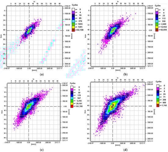 Rain flow matrix of the damper velocity (front): (a) Highway; (b) Country road; (c) City road; (d) Unpaved road.