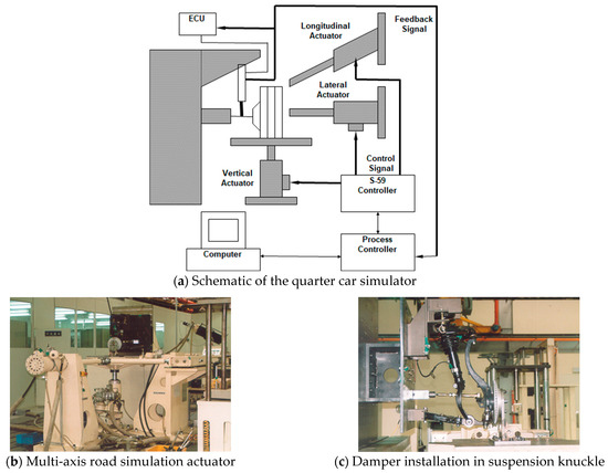 The testing machine for the simulation test was composed of a quarter car model to reproduce the damper’s vertical, lateral, and longitudinal direction movement. Figure 10 is the configuration diagram of the quarter car simulator. A simulation test was conducted on a general road using this tester.