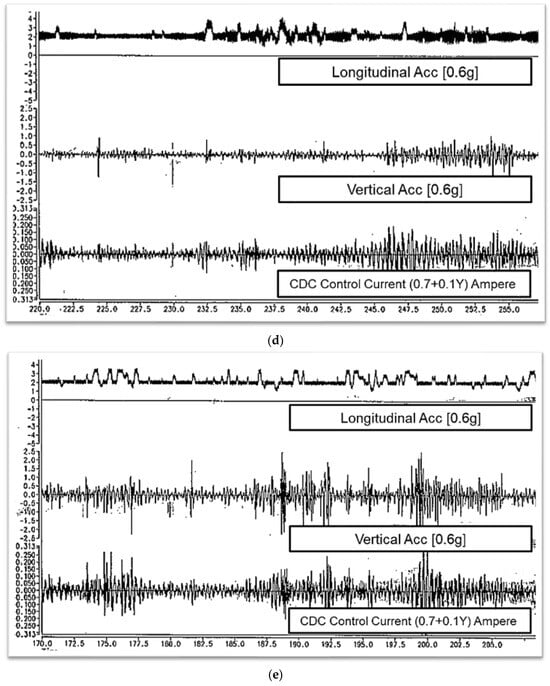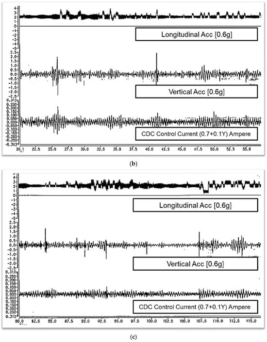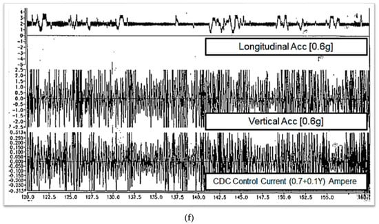 As described above, a Drive File was created using the configured system that reproduces the vertical direction, longitudinal direction, and the current applied from the ECU accordingly. This drive signal is the load and current signal measured on each road with a road configuration combined at a specific ratio, as shown in Table 2, which is the endurance test mode that is the purpose of this study. The drive signal created through the processes of RLDA, iteration, and editing is shown in Figure 11. This is about 165 MB per channel, a total of 500 MB, and corresponds to a driving distance of 500 km at an average speed of 71.4 km/h. In addition, only a portion corresponding to about 40 s of the signal that simultaneously represents the three vertical, longitudinal, and ECU current channels of each driving road is shown in Figure 11a–f. In Figure 11a, channel No. 1 is the signal in the longitudinal direction, which reproduces the condition input from the vehicle’s traveling direction. Also, channel No. 3 reproduces the vertical signal, channel No. 4 reproduces the ECU’s input current, and all three channels are synchronized, and general national roads, expressways, city roads, and unpaved roads are mixed. Figure 11b shows the driving signal of a general national road, and it can be seen that there is some signal input in the vertical and longitudinal directions, but the change in the ECU’s input current is not large. Also, Figure 11c shows the driving signal of a highway, and although the input waveform is not much different compared to that of a general national road, it can be seen that fast ECU control is performed due to high-speed driving. Figure 11d shows a general signal of a city road and a somewhat gradual change, but Figure 11e shows a subway construction section of a city road. A large input waveform is observed compared to the signal of Figure 11d. It can be seen that the longitudinal waveform is measured considerably larger on city roads than on general national roads or expressways. This implies that the longitudinal impact is more significant when driving on city roads than on national roads or expressways with gentle handling and a straight line tendency. Figure 11f, which shows the most considerable waveform change, is the drive signal of an unpaved road, and the vertical and longitudinal signals and the current the ECU applied show an extensive range of change. This means the harshest conditions. This waveform reproduction shows an error rate of 92%, which is about 3% lower than the initial target of 95% due to the limitations of the simulator’s speed and stroke.