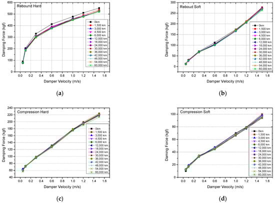 That is one of the potential failure modes from the FMEA results. In addition, the rebound soft damping force reduction was measured to be 5 kgf, a 7% decrease from the initial value, and the compression hard and soft damping forces showed almost no change as measured in the test results. The damping force reduction before and after the simulation test was mainly focused on the rebound hard damping force, which had a relatively large damping force, and the change in the compression damping force was insignificant. The damping force change by driving distance in the simulation test is shown in Table 4. The damping force change by excitation speed in each mode is shown in Figure 12.