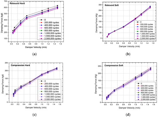 Based on the test device and method described above, the target durability test was performed on the semi-active damper, and the damping force change was measured every 200,000 cycles during one million cycles in Soft/Soft Mode. Measurements were also performed after 500,000 cycles in Hard/Soft Mode and 500,000 cycles in Soft/Hard Mode. After one million cycles in Soft/Soft Mode, both SMPL #1 and #2 showed a 10% decrease in damping force in rebound hard, and then after 500,000 cycles in Hard/Soft Mode and 500,000 cycles in Soft/Hard, the damping force decreased by 13% and 16%, respectively. The damping force change after the target durability test also showed a significant decrease in rebound hard damping force, just like the damping force after the simulation test, and it could be seen that there was no considerable decrease in rebound soft and compression damping forces. The results of the target durability test are shown in Table 6. The change in damping force according to the excitation speed in each mode is shown in Figure 14, respectively. The flow resistance of the oil generates the damping force of an electronically controlled damper, so the properties of the oil are essential, especially the dynamic viscosity characteristics. The dynamic viscosity is greatly affected by the characteristic of heat, and over time, the viscosity may decrease due to internal friction, contamination, and pressure. In addition, the piston rod of an electronically controlled damper may become contaminated with dust and foreign substances as it repeats tension and compression, and the oil may be deposited on the piston rod and evaporate, which may reduce the amount of oil and cause a decrease in the internal pressure of the damper. In this study, we attempted to confirm these changes according to driving conditions and operating cycles.