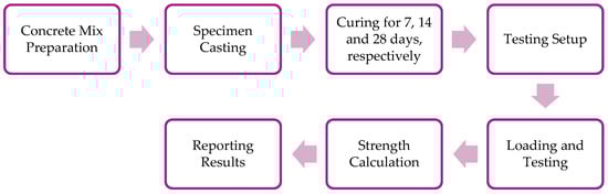 Six specimens were cast for each replacement ratio except for 0.75% wt. of cement (86.55 g) and 1% wt. of cement (113.6 g), where five specimens were cast for each replacement ratio. The molds used had the dimensions of 150 × 150 mm. To prepare the mold for use, a thin layer of oil was applied to the joints between the mold sections and the contact surfaces of the bottom of the mold and the base plate. Concrete specimens were prepared with varying amounts of molasses waste by replacing that percentage of the cement, following the guidelines stated in ACI code 211.1. Initially, two batches of specimens were prepared, one with a 1% wt. of cement (113.6 g) molasses and another with a 2% wt. of cement (230.8 g) molasses dosage, which were poured and tested accordingly. However, after 7 days of testing, these specimens did not exhibit sufficient strength. As a result, the focus of the study shifted to lower dosages of molasses, specifically 0.25% (28.85 g), 0.5% (57.7 g), and 0.75% (86.55 g) by weight of cement. The specimens were demolded after 24 h, except the 0.25% wt. of cement (28.85 g) waste molasses specimens, which were demolded after 48 h. This delay in the setting of the concrete highlights the retarding properties of the molasses waste when added to the mixture. The compressive strength of the concrete was found through a compression test for different replacement ratios of molasses. The concrete ratio used was 1:1.89:2.32 and the temperature ranged from 25 °C to 30 °C. Compression tests were carried out on samples cured at 7 days, 14 days and 28 days as per ASTM C39/C39M [49]. Two specimens were tested for each testing period, i.e., 7, 14, and 28 days, respectively, whereas one sample was tested for a 7-day testing period for 0.75% (86.55 g) and 1% (113.6 g) replacement ratios, respectively. The procedure flow is summarized in Figure 1 below.