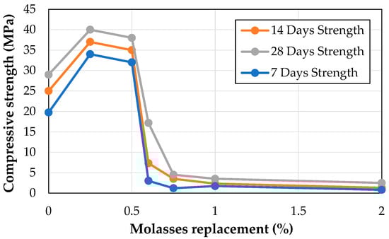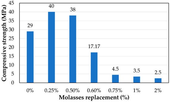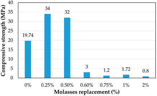 The addition of 0.25% wt. of cement (28.85 g) molasses increased the compressive strength by 41.35%. Similarly, as the molasses percentage increased from 0.5% wt. of cement (57.7 g) to 0.6% wt. of cement (68.7 g), the compressive strength remarkably decreased from 32 MPa to 3 MPa. However, a significant decrease in compressive strength was observed for the samples with higher molasses replacement percentages. The compressive strength results at 7 days for different percentages of molasses replacement are presented in Figure 2.