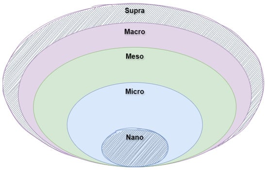 The curriculum encompasses five curricular levels, which can be (1) supra, encompassing international standards [29]; (2) macro, which considers components of the curriculum at the country level; (3) meso, which considers components such as careers and programs at the institutional level; (4) micro, which considers components at the course level; and (5) nano, which considers components at the personal level [30,31]. Figure 1 depicts the relationship between these levels and examples of curricular components that contain them.