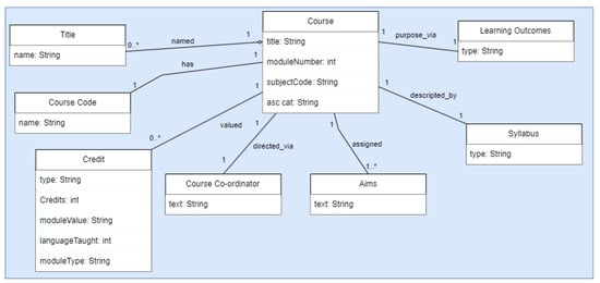 The XCRI-CAP model, mainly used in the UK, facilitates the visualization and mapping of curriculum content using a metamodel of class diagrams in UML, which helps standardize terminology and clarify the curriculum structure. This model focuses on transparency and coherence of curriculum design, providing a valuable tool for curriculum management and review [94]. Figure 3 presents an example of the platform used. As can be seen, the model includes only components at the micro level but considers some important aspects at the meso level, such as career competencies. On the other hand, Sarkar and Negi [87] use UML to visualize the design process for modeling various components of an online course [87]. These proposals present curriculum models only at the micro level.