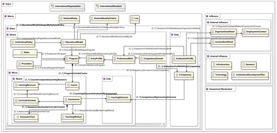 However, currently used curriculum models present several limitations and problems. Most of these models focus only on the micro level, neglecting integration and alignment at the macro and meso levels [17,18], even with the supra level. In addition, many models do not use a common language that facilitates communication and collaboration in interdisciplinary teams, which leads to inconsistencies and hinders effective curriculum implementation [14,19]. Additionally, these models often do not allow for the development of computer systems to support the curriculum design process, as they do not employ recognized standards in the software industry, which limits their applicability and efficiency [20,21].