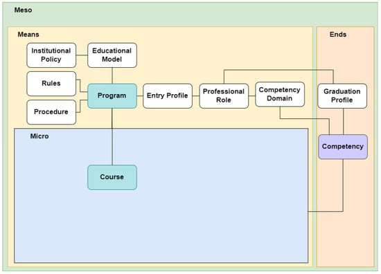 The meso level is the concretization of a curriculum where the syllabuses developed by educational institutions are formulated [31,32]. For this purpose, educational institutions create interdisciplinary work teams to address different aspects of a profession [14]. At this level, institutions define student performance domains, the educational model, the graduate profile, and other elements that must be related to ensure that the professional is competent for the world of labor [34,35,36].