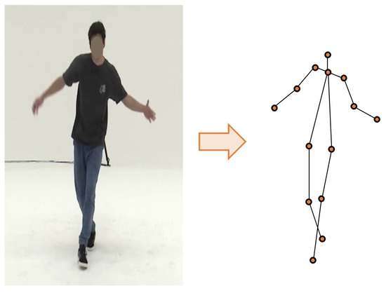 The physical variation in body movement over time is tracked by monitoring the positions of a dancer’s joints in video frames, which not only captures the overall characteristics of the body’s motion but also indirectly reflects the tempo and mood of the entire dance. To achieve this, the joint positions of the dancer in each video frame must first be detected, and in this study, OpenPose [33] was used for joint position estimation. The positions of 14 joints, as shown in Figure 2, were extracted, and the speed and acceleration of each joint over time were calculated based on these position values. To capture the overall characteristics of the body’s movement, the speed and acceleration values of all joints were averaged to derive the body’s mean speed and acceleration. These values were then averaged over time to calculate the body’s overall mean speed and acceleration. Rather than directly using the calculated average speed and acceleration, these values were translated into descriptive terms that could be intuitively utilized by the LLM to generate captions. The mean speed and acceleration values were categorized into five groups each and used as tags. For category selection, the average speed and acceleration of the dancer were computed for all single-dancer videos in the AIST++ dataset, and the 20th, 40th, 60th, and 80th percentiles of this distribution were chosen as thresholds. Based on these thresholds, speed was divided into five categories: rapid, high, moderate, low, and slow, while acceleration was categorized as rapid, high, moderate, gradual, or slight.