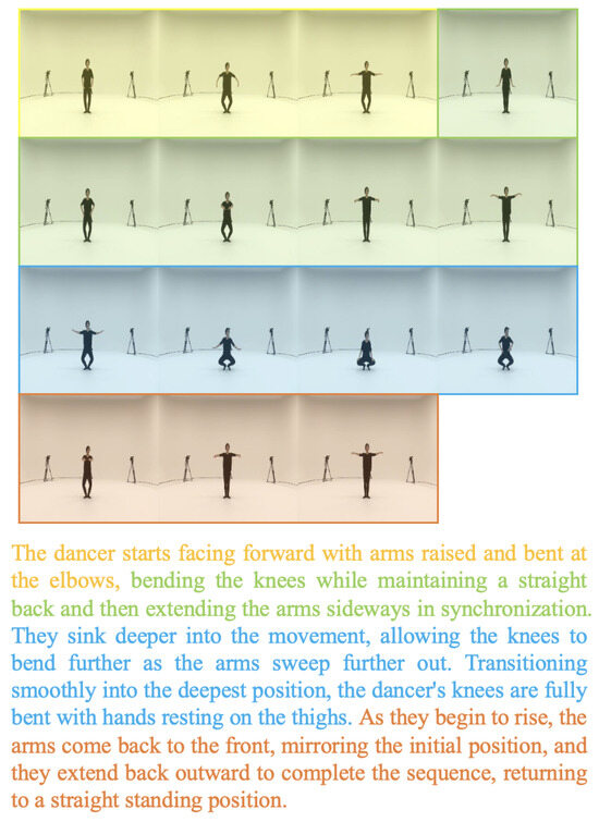 In this study, three distinct types of captions were defined based on their purpose in dance captioning. The first type, known as the ‘dance summary caption’, was constructed primarily from the extracted dance tags to provide a basic description of the dance. This caption served as the fundamental form of description, capturing essential components of the dance. However, while the ‘dance summary caption’ provides a general overview, it may not encompass the full scope of the dance video, which includes temporal choreography and additional contextual components beyond the dance itself. To address this limitation, the second type of caption, termed ‘time series motion caption’, was designed to detail the sequence of dance movements over time. This type captured dynamic changes and intricate details that the ‘dance summary caption’ might have overlooked. The final type, referred to as the ‘multimodal caption’, aimed to represent non-dance components, such as music, dancer characteristics, and environmental factors, as well as the interactions and harmonies between these components and the dance.