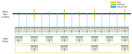 Similar to CLIP-based video captioning algorithms, the process of extracting temporal motion tags using LLMs is costly due to the use of video frames for captioning. Utilizing all frames from the video for captioning inherently introduces redundancy, and duplicated embeddings or captions can negatively affect the final caption quality. Therefore, it is necessary to sample frames in a way that sufficiently captures temporal changes in the motion while minimizing unnecessary frames. Dance is inherently linked to the rhythm and beat of the accompanying music [39,40,41], and the positions of the beats in the music serve as important markers that divide and define key choreography movements. However, if captioning is performed using only the frames corresponding to the beat positions, information about the transitional movements between beats may be lost, so it is also necessary to include inter-beat frames. In the proposed method, frames corresponding to beat positions and evenly spaced intervals between beats are sampled, as shown in Figure 4. The optimal frame selection interval is experimentally determined to achieve the best results.