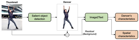 Features or elements of the choreography video that were not described by previous tags, such as characteristics of the dancers or the environment, were classified as other tags. These tags included attributes related to the dancer, called dancer characteristics, such as their number, attire, and gender, as well as background details, also called spatial characteristics, like camera position and whether the setting was indoors or outdoors, and the time of day. Figure 6 shows the entire process undertaken to extract other tags. We first chose the very first frame of the video as the thumbnail, where the dancer is holding the initial pose and remaining still, as the music has not yet started and the dancer is in a state before beginning to move. To extract both the characteristics of the dancer and the place where the dance is being performed, the thumbnail was separated into the picture of dancer on an empty background, with the residual representing place. For separation, we adopted a salient object detection algorithm [45] to crop out the dancer from the thumbnail. An image of the dancer was then applied to the image-to-text model [10] to obtain dancer characteristics, like costume, gender, and notable features of the dancer. The residual image was also applied to the image-to-text model to obtain spatial characteristics, depicting the features of the background.