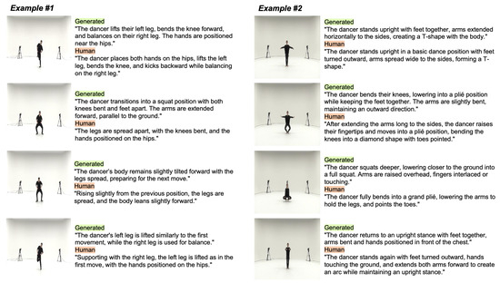 Therefore, the development of a dance caption dataset with paired dance movements and natural language descriptions could significantly expand research possibilities. Unlike previous methods requiring direct annotation of dance–caption pairs, recent advancements in LLM and pseudo-captioning techniques present new opportunities for generating such paired datasets. These technological advancements are expected to facilitate the creation of dance caption datasets, enhancing the scope and depth of choreographic research.
