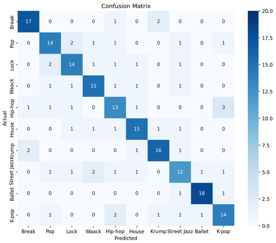 To assess the accuracy of the dance genre classification, we utilized a dataset comprising 1500 dance videos for training our proposed model and evaluated its performance on a dataset of 200 in-the-wild videos evenly distributed across 10 dance genres. The train dataset was constructed based on the AIST++ dataset, supplemented with additional in-the-wild videos collected from social media platforms to reflect real-world conditions. The proposed model achieved an average classification accuracy of 72% on the test set, demonstrating good performance in classifying diverse dance videos in in-the-wild environments. The confusion matrix shown in Figure 8 provides a details of the model’s classification performance.