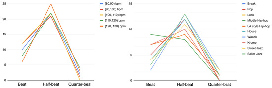 Participants’ preferences for temporal motion tags extracted in beat, half-beat, and quarter-beat intervals based on music BPM and dance genre. Participants reviewed the videos and tags and selected the tag they felt most accurately described the motion.