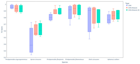 On average, the F1-Score increased by about 7% going from CNN to CNN + Module in both directions, ranging from a 6.3% increase on Etelis coruscans species to 38.7% on Aprion virescens species (Table 4).