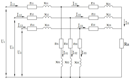 U1, U2, and U3 are the main voltages for each motor; I11, I12, I13, I21, I22, and I23 are the stator and rotor currents of the machines; r11, r12, and r13 and x11, x12, and x13 are the active and inductive resistances of the stator windings for the corresponding motors of the system with electrical connections through rotor circuits; r21, r22, and r23 and x21, x22, and x23 are the active and inductive resistances of the rotor windings; x01, x02, and x03 are the inductive resistances of the magnetization circuits; Ra is the additional resistance in the rotor circuit; S is the slip; and φ1, φ2, and φ3 are the angular shifts of the rotors in electrical degrees relative to the accepted reference axis.