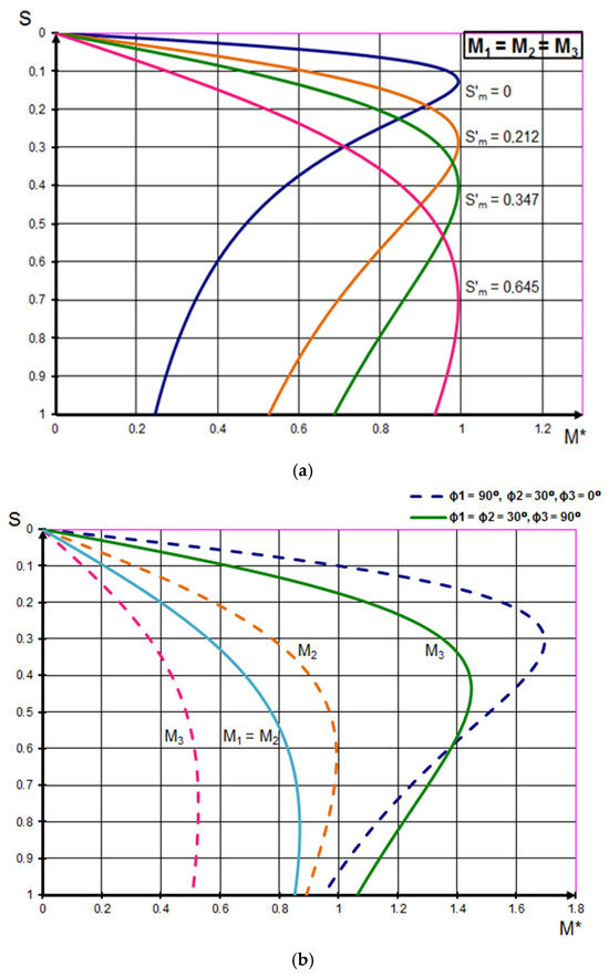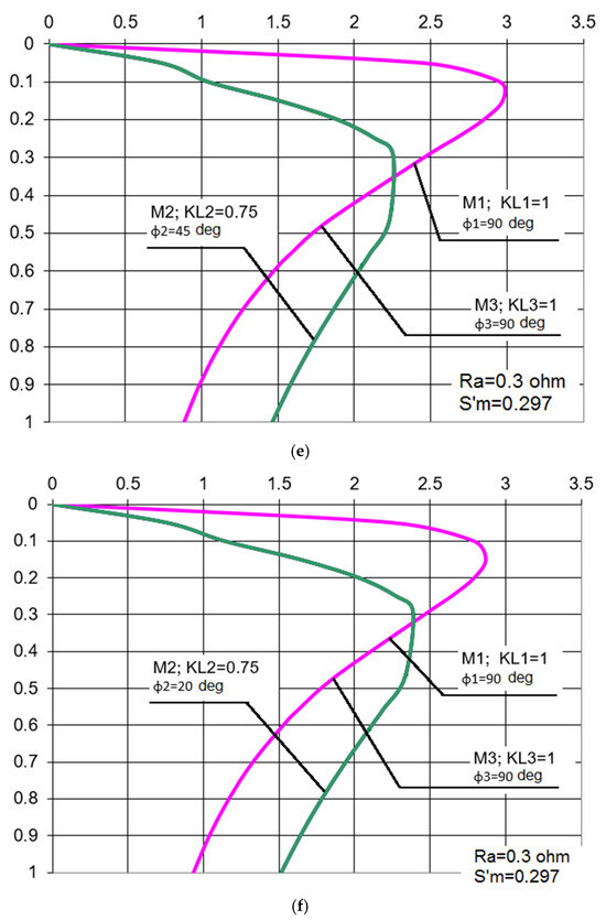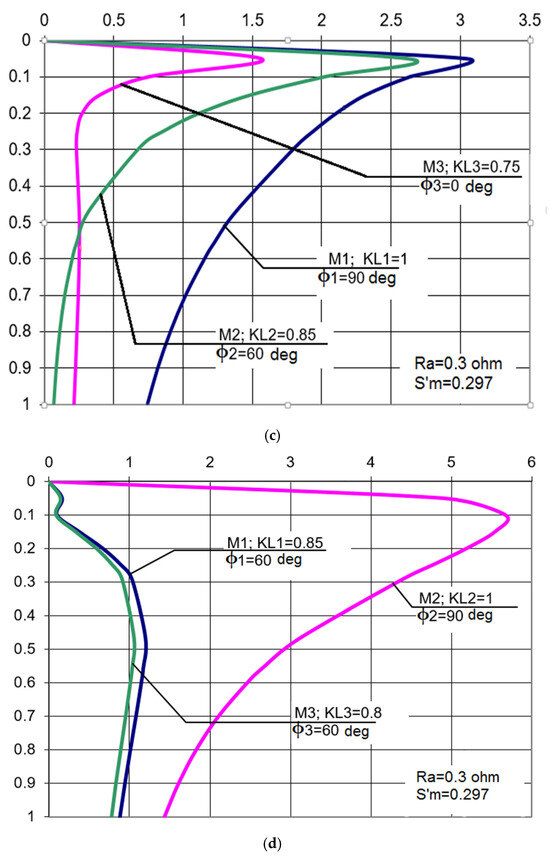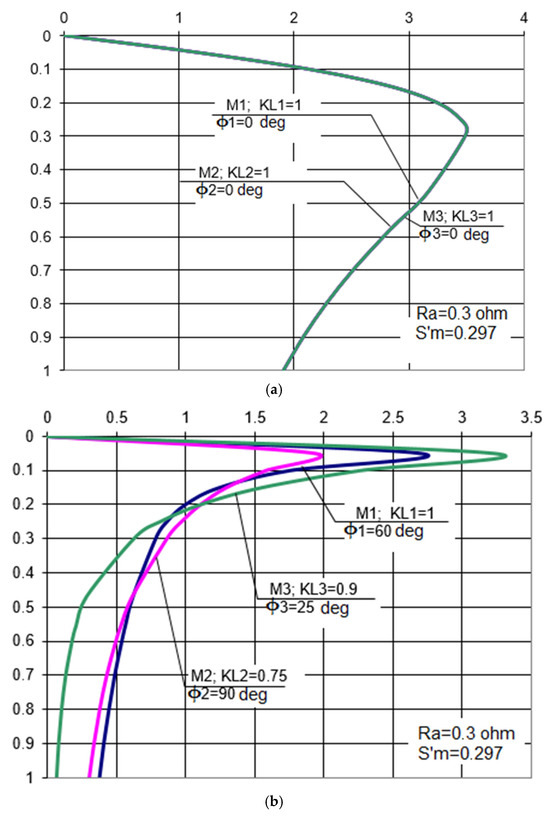 The results of the calculation are shown in Figure 3. Next, we calculated and built curves for the mechanical characteristics representing three values of additional resistances corresponding to three stages and critical slips, S′m = 0.212, 0.347, and 0.645 (Figure 3a), and mismatch angles (Figure 3b), , and (Figure 3c) of the engine rotors.