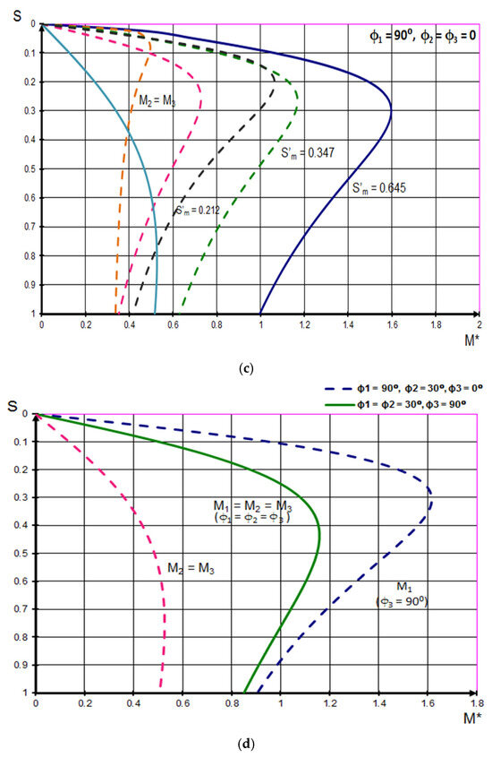 Mechanical characteristics of a three-motor electric drive carding machine (CM) at different mismatch angles and levels of total rotor resistance. (a) For different values of Ra corresponding to critical slip: blue S′m = 0 (without additional resistance Ra = 0); orange line S′m = 0.212; green line S′m = 0.347; red line S′m = 0.645. (b) M1 is the moment of the first engine, dotted blue line, M2 is the moment of the second engine, solid green line φ1 = φ2 = 30°, φ3 = 90° is the moment of the second engine, dotted orange line, M1 = M2 are equal moments of the first and second engines (φ1 = φ2 = 30°, φ3 = 90°), M3 is the moment of the third engine, dotted red line (φ1 = 90°, φ2 = 30°, φ3 = 0°). (c) M1 moment of the first engine, M2 = M3 moments of the second, third engines (φ1 = 90°, φ2 = φ3 = 0°, S′m = 0.645), M1 moment of the first engine, M2 = M3 moments of the second, third engines (S′m = 0.347, φ1 = 90°, φ2 = φ3 = 0°), M1 moment of the first engine, black dotted line M2 = M3 moments of the second and third engines, orange dotted line (S′m = 0.202, φ1 = 90°, φ2 = φ3 = 0°). (d) M1 moment of the first engine, blue dotted line, M2 = M3 moments of the second, third engines, red dotted line (φ1 = 90°, φ2 = φ3 = 0°). M* = Mn/Mnom—relative moments of engines (n = 1, 2, 3).